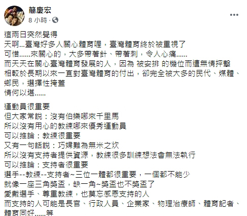 再者,為了避免造成運動員困擾,筆者並未針對此事,訪問任何運動員或教練,文中的內容,全部都是透過FB的搜尋功能,找到後再截圖,忠實、客觀呈現運動員的想法。
