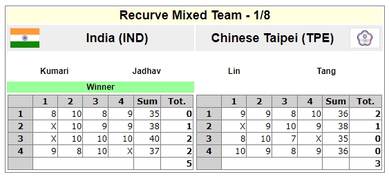 關鍵的第四局,前兩箭湯智鈞10分、林佳恩9分,以19:17領先印度,惜最後兩箭林佳恩和湯智鈞各8分和9分,被最後兩箭都射出10分的印度以37:36後來居上,5:3逆轉勝,止步16強。
