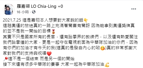 謹記教練劉聰達所說:「盡情揮灑,不留遺憾,打一場不讓自己後悔的比賽。」會運動也會讀書的19歲跆拳道「長腿靚妹」羅嘉翎,首度出征奧運便闖進女子57公斤級銅牌戰,並以10:6獲勝勇奪銅牌。