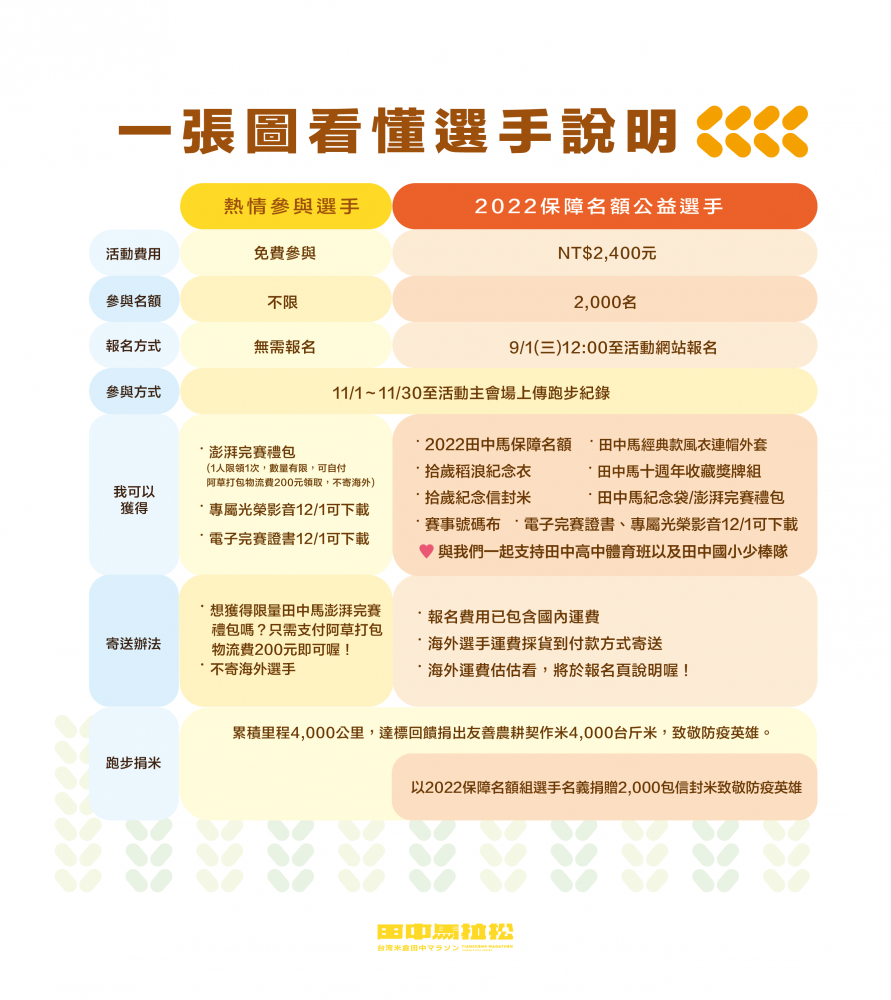 邁入第十年的台灣米倉田中馬拉松,因應防疫改為免費的線上跑活動,並規劃了做公益的「保障名額公益選手」2000名,除了可得到十周年限定紀念物與紀念信封米,更可獲得2022年的田中馬「免抽籤」保障名額。
