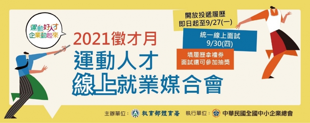 教育部體育署「推動企業聘用運動指導員」計畫,首次於「i運動資訊平台」舉辦「2021徵才月:運動人才線上就業媒合會」,即日起至9月30日進行線上徵才活動,歡迎企業及具體育運動背景人員踴躍參與。