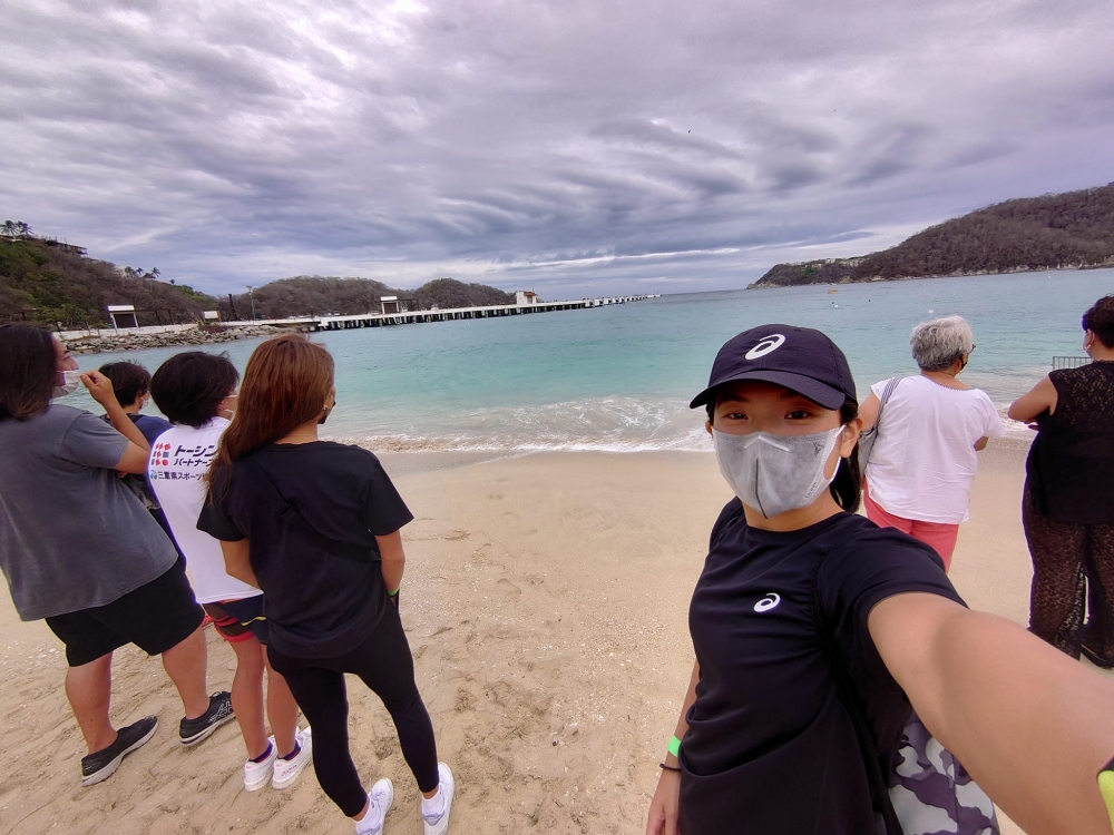 今天中午大會開放場地試游(只有游泳,騎車看影片,跑步看地圖),出發去會場時在門口遇到了超強直臂跑步女選手的教練,我們一路聊到海灘。